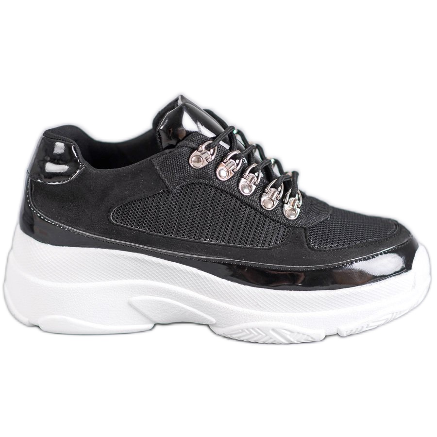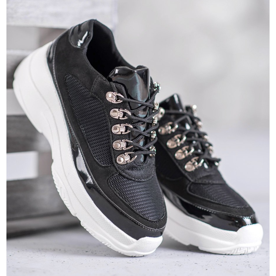 A parte superior preta do calçado é decorada com inserções de malha, o que garante ótima ventilação e conforto no uso, mesmo nos dias mais quentes. Plataformas com 5,5 cm de altura não só conferem leveza à silhueta, mas também isolam do solo, o que prejudica o conforto de uso. A lingueta envernizada, o contraforte do calcanhar e os detalhes elegantes na parte superior são elementos que conferem ao calçado carácter e um aspecto moderno.