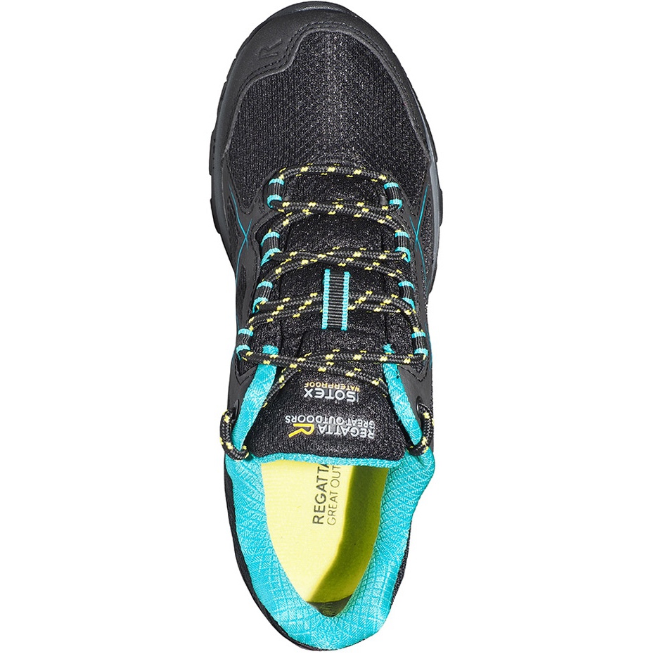 Sapatos femininos Regatta WMS KOT LOW RWF489 41QF - sapatos leves, impermeáveis e confortáveis, perfeitos para viagens mais curtas e saídas diárias no campo. Uma estrutura de análise única com a membrana isotex fornece proteção contra a umidade com boa respirabilidade, e o revestimento hidrofóbico do hidroplel protege adicionalmente o material externo. Uma sola estável e técnica feita de borracha termoplástica e espuma EVA oferece piso adesivo e conforto durante a marcha. O acabamento preto com detalhes azuis da Turquoise cria uma aparência moderna e esportiva.