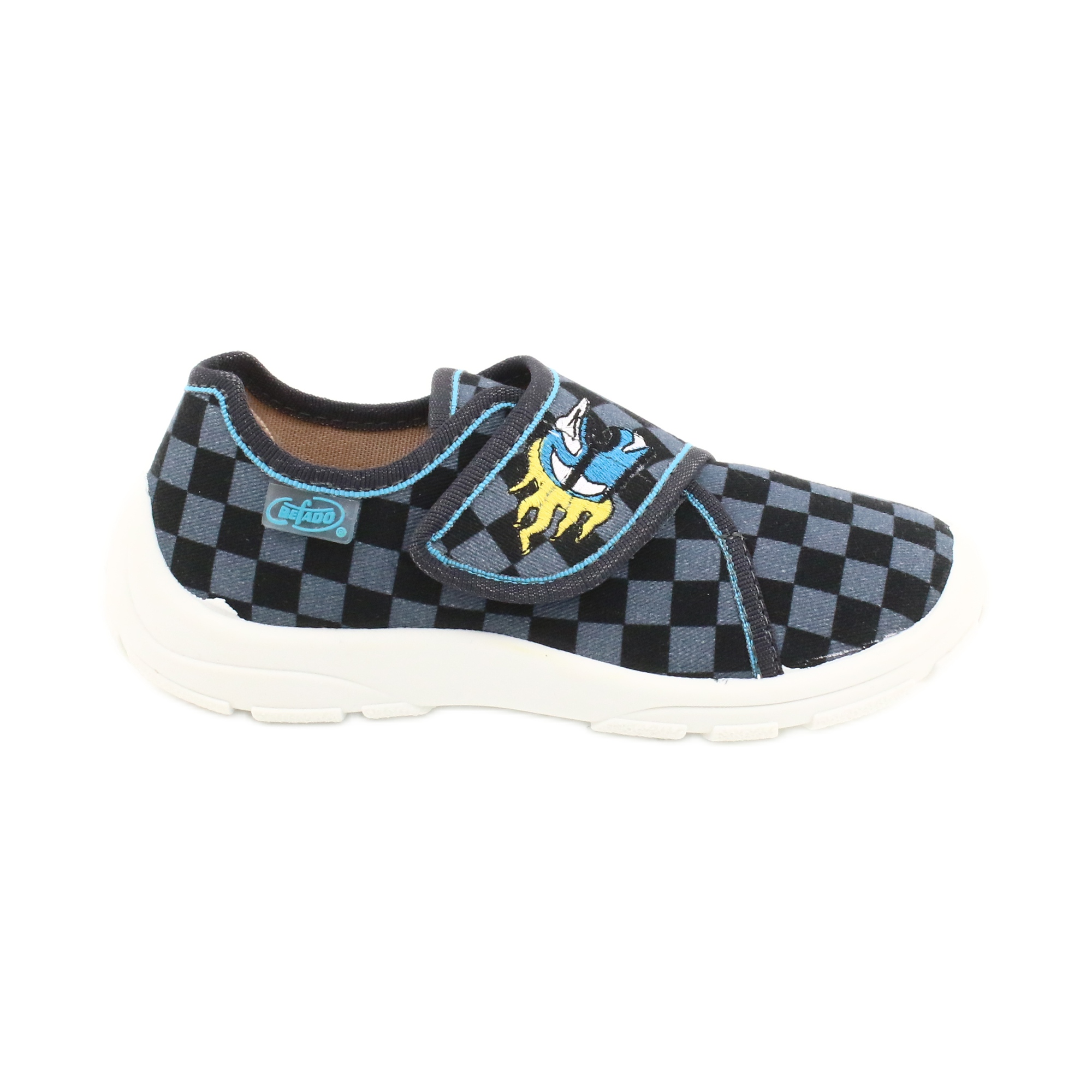 Os calçados infantis Befado 974X411 são a escolha perfeita para meninos ativos que valorizam conforto e estilo. Feitos de tecido de alta qualidade, esses chinelos não só têm uma aparência atraente, mas também fornecem suporte adequado para os pés jovens. A parte superior xadrez azul e preta, decorada com um atraente patch, certamente irá agradar a muitas crianças.