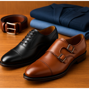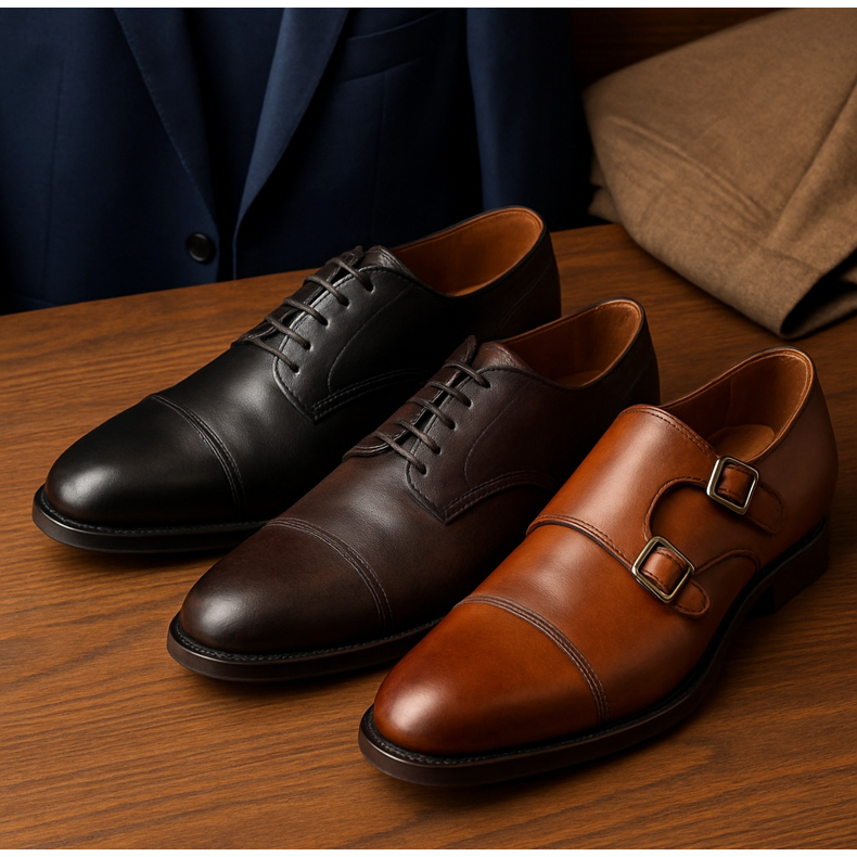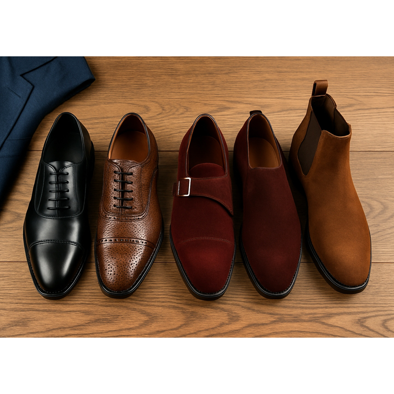Sapatos Derby, sapatilhas, tiras Monk, mocassins. Cores: marrom, bordô, azul marinho.