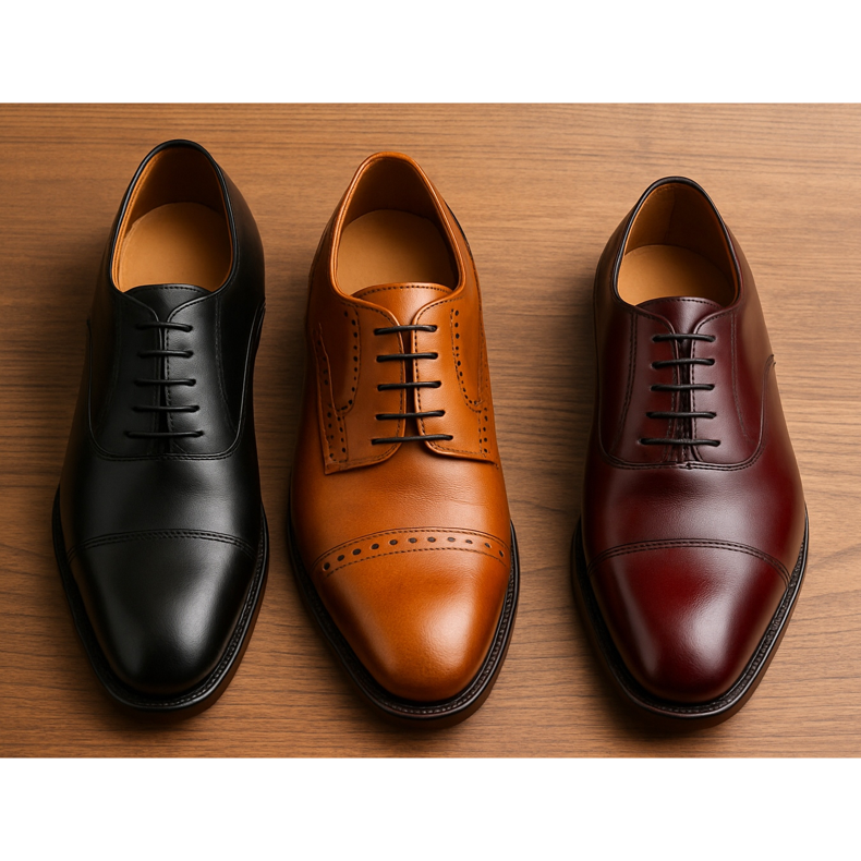 O mais formal. Cap toe (com costura na ponta) = clássico para terno.