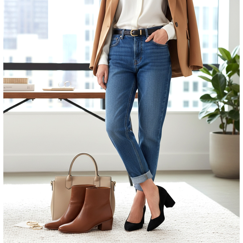 Calças boyfriend também podem ser usadas no escritório, desde que você as estilize de maneira adequada. Sapatos elegantes de salto alto são os melhores para o trabalho, pois alongam opticamente as pernas e acrescentam graça à sua silhueta.