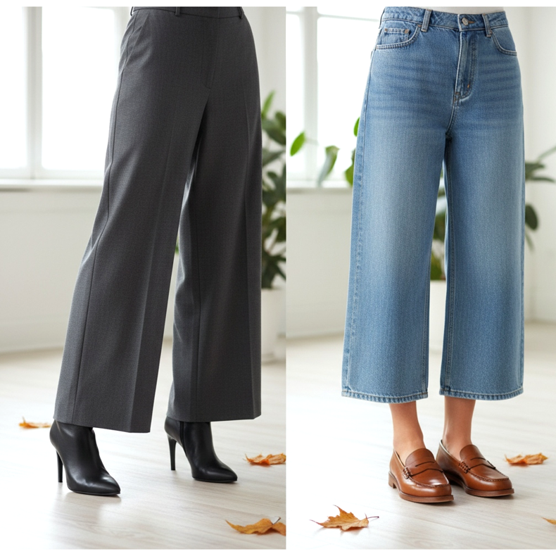 Muitas mulheres não percebem a importância do papel que o comprimento da perna desempenha em relação à altura do salto quando se usam pernas largas. A regra mais simples: quanto mais longa a perna, mais alto é necessário o salto para não arrastar no chão e não encurtar visualmente a figura.