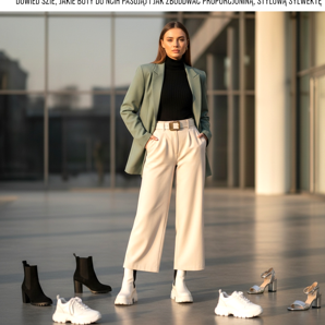 Sapatos de salto alto e salto alto são uma das melhores combinações - pernas largas e elegantes combinadas com salto agulha criam um visual dramático e alto no estilo dos anos 70. Combinada com calças palazzo de seda ou cetim, essa combinação faz sucesso nos passeios noturnos. Cunhas e sandálias sobre plataforma maciça são igualmente eficazes - graças a elas ganhamos altura e ao mesmo tempo podemos sentir-nos mais estáveis do que de salto alto. As botas de cowboy são outra ótima opção para jeans de perna larga - sua parte superior característica aparece sob as pernas largas de uma forma muito impressionante.