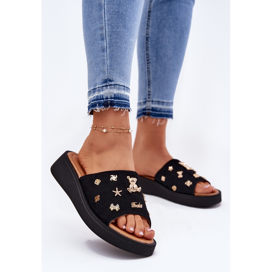 Graças à plataforma de 3 cm de alta, esses chinelos oferecem estabilidade e suporte, o que os torna um excelente companheiro diariamente e durante as saídas de verão. Os alfinetes da moda no cinto lhes dão um personagem único, atraindo os olhos e enfatizando a individualidade do proprietário.