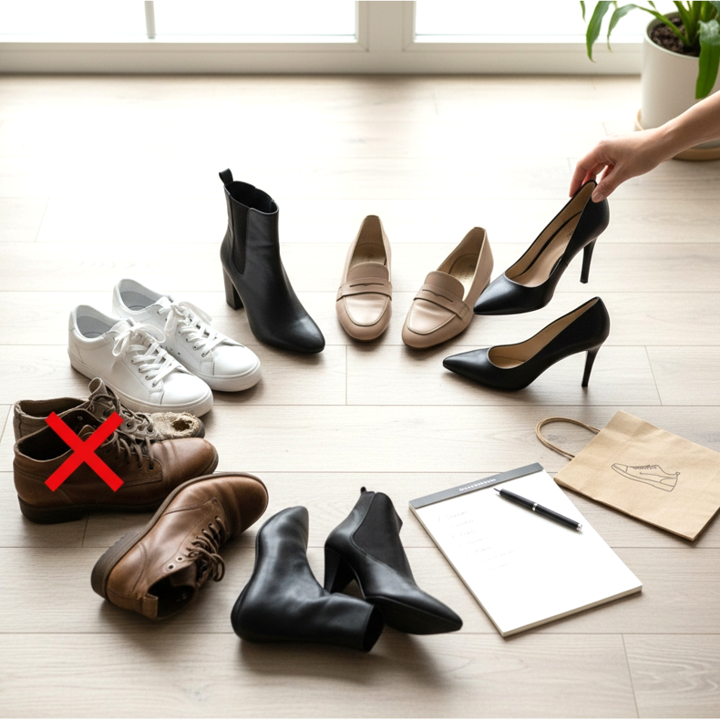 Construir um guarda-roupa cápsula é um processo, não uma compra única. Comece auditando sua coleção atual de sapatos – tire todos os sapatos do armário, avalie sua condição, utilidade e com que frequência você os usa. Livre-se de pares desgastados, desconfortáveis ou que simplesmente não combinam com nada. Em seguida, identifique as lacunas – qual das cinco categorias principais está faltando no seu guarda-roupa?