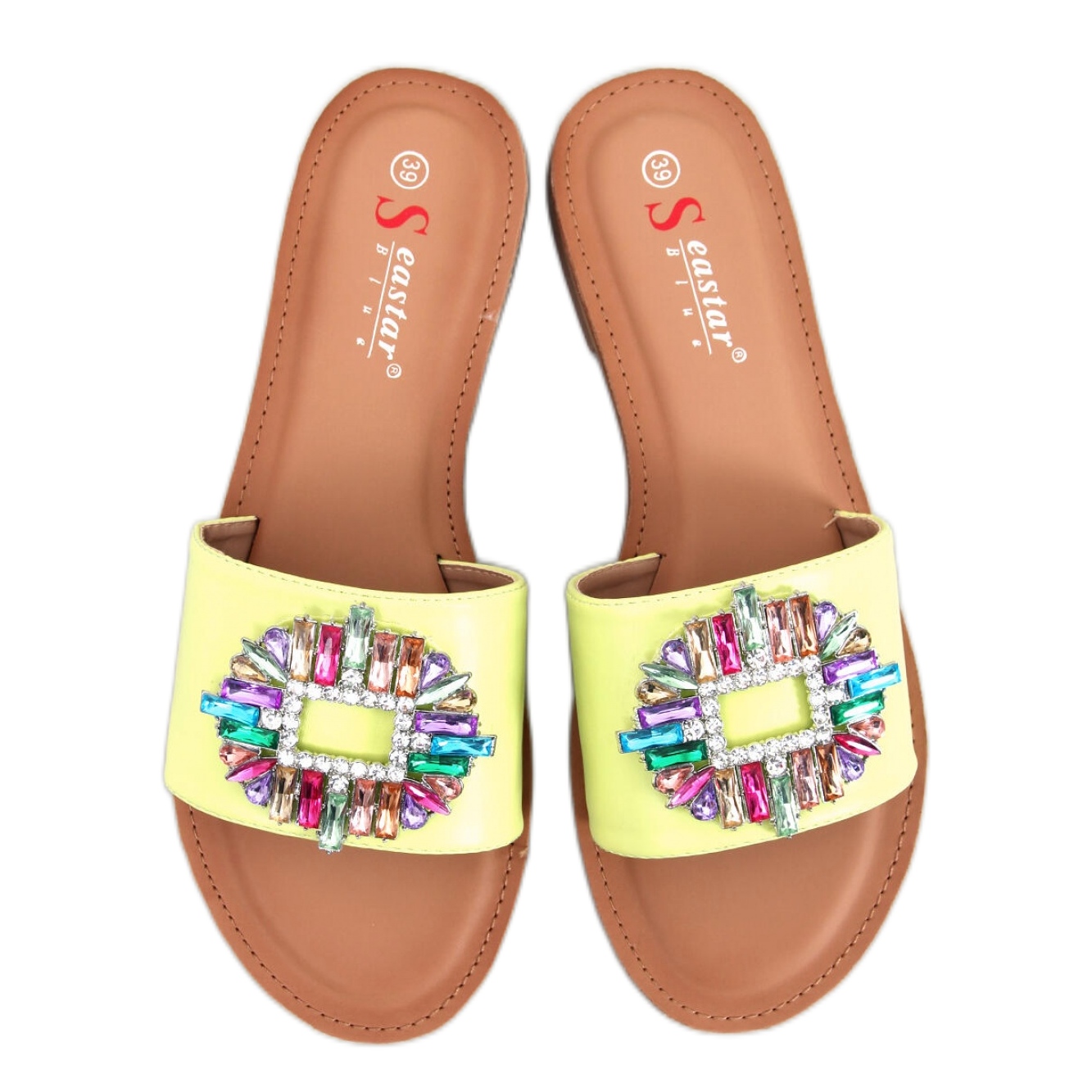Apresente um pouco de cor e brilho em seu guarda -roupa, graças às sandálias de abas verdes Lowell da marca Inello. Esses chinelos femininos elegantes em uma sola plana combinam conforto e design exclusivo. Uma tira ampla decorada com pedras coloridas e brilhantes chama a atenção e faz com que todas as estilização assumam um personagem único.
