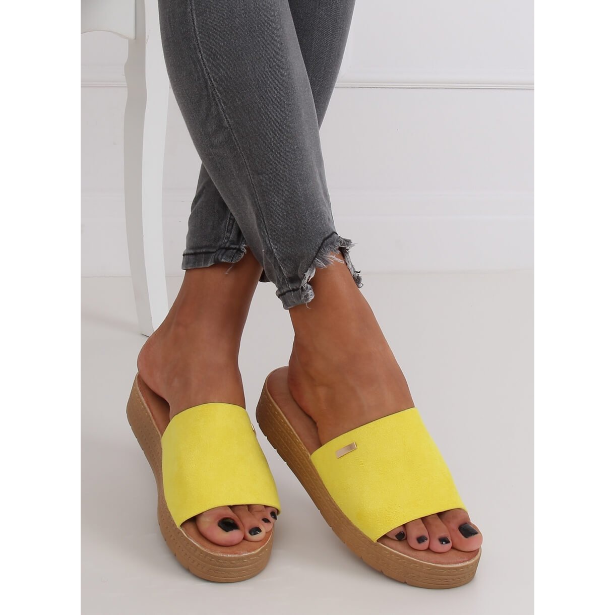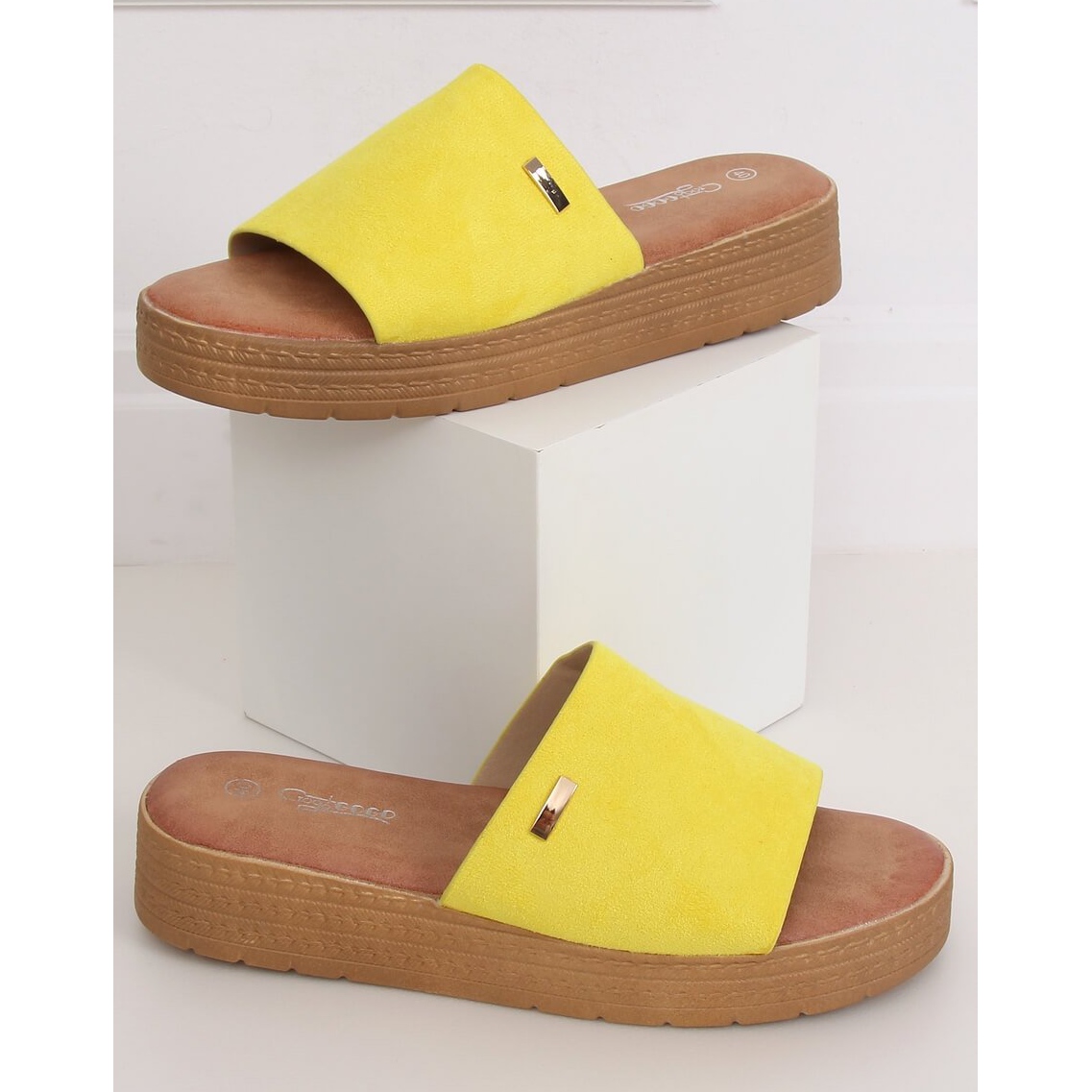 Os chinelos amarelos femininos G-576 Yellow são a escolha perfeita para os dias quentes e ensolarados. Estas elegantes mulas de cunha com 4 cm de altura combinam um design moderno com conforto de utilização, o que as torna um complemento perfeito para o estilo do dia a dia.