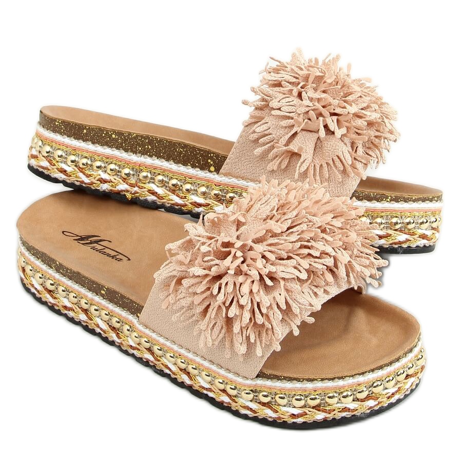 Descubra o último hit da temporada - chinelos bege com sola decorada 2260 Beige! Estes chinelos femininos de camurça são uma combinação de estilo, conforto e originalidade que certamente chamarão a atenção. As expressivas aplicações florais, assim como os strass e as franjas conferem-lhes um carácter único, tornando-os na escolha perfeita para o verão.