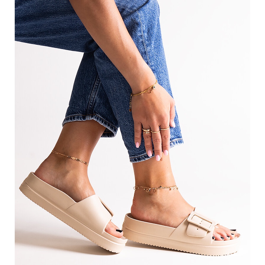 Os chinelos caracterizam-se por um salto médio de 5 cm, que acrescenta um pouco de elegância e ao mesmo tempo é suficientemente estável para garantir um caminhar confortável. A costura excepcional e o acabamento cuidadoso enfatizam seu caráter moderno, e a falta de padrão os torna universais e atemporais.