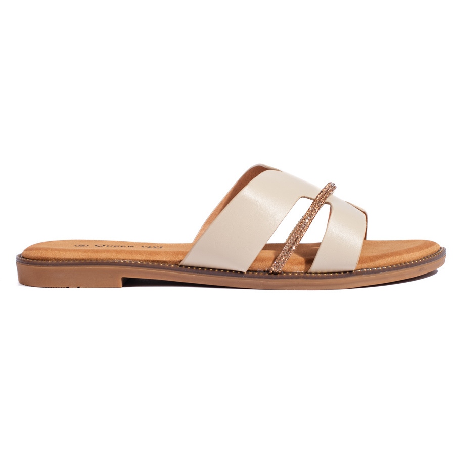 Feito de imitação de pele de alta qualidade, os chinelos são duráveis e fáceis de cuidar. O salto aberto e a estrutura inserida os tornam extremamente práticos e confortáveis de usar. Uma vantagem adicional são os strass sutis, que lhes dão um personagem elegante e os tornam um complemento perfeito para estilizações casuais e mais de saída.