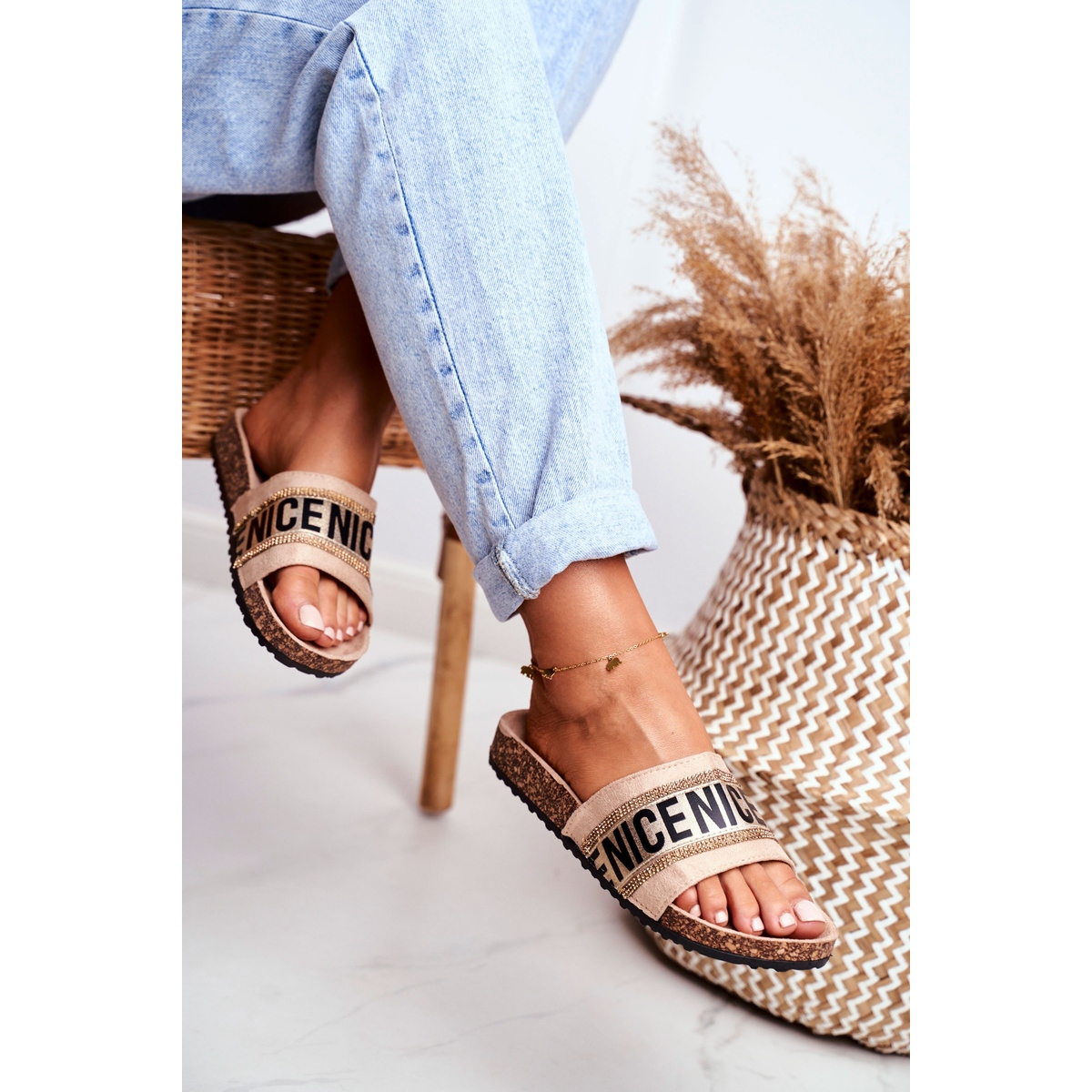 Esses chinelos são distinguidos por uma decoração espetacular na forma de zircões, que brilham lindamente no sol do verão, acrescentando um pouco de brilho e caráter único. Uma sola confortável e de cortiça oferece excelente suporte para os pés, o que os torna uma escolha ideal para caminhadas diárias e passeios de verão.