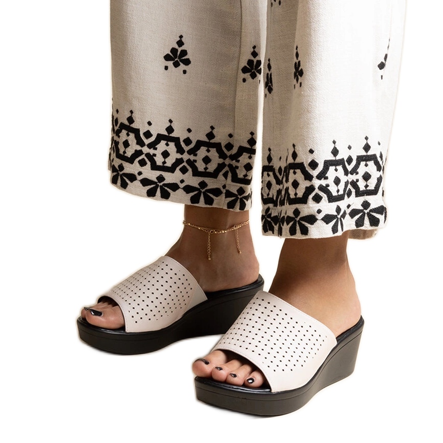 Os chinelos brancos de trabalho aberto em uma cunha Eco Leather Garvin é a escolha perfeita para os dias de verão que combinam design da moda e conforto de desgaste. Feito de couro ecológico de alta qualidade, eles garantem durabilidade e conforto, mesmo nos dias mais quentes. Graças ao padrão de trabalho aberto, os pés podem respirar livremente, o que aumenta ainda mais o conforto do uso.