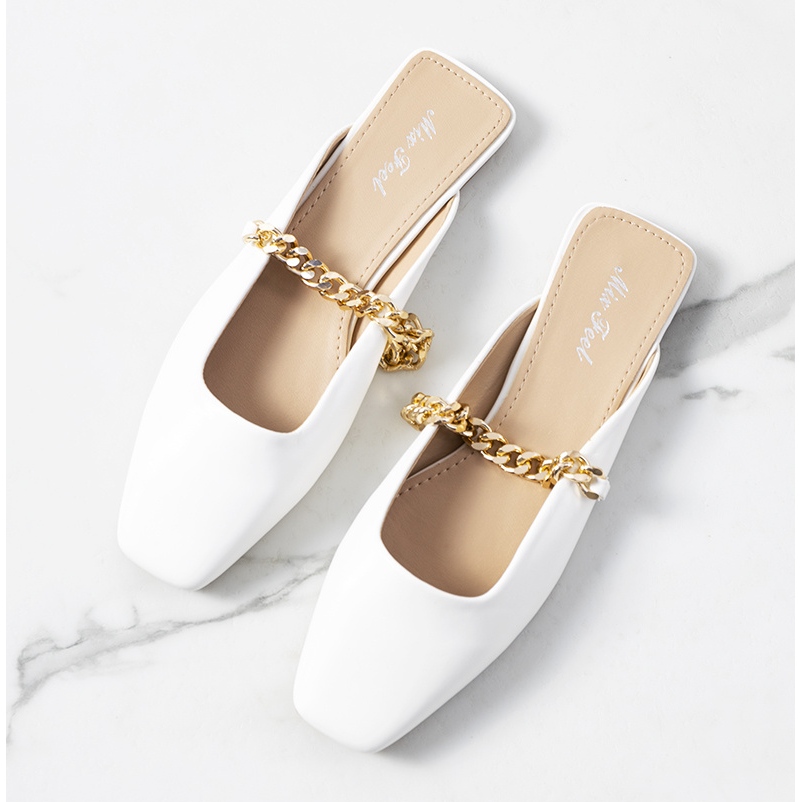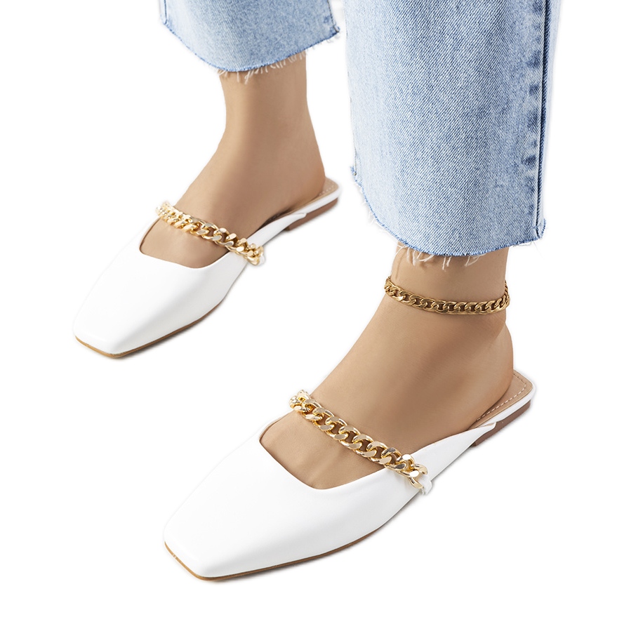 Flips clássicos de fardos brancos são uma combinação de elegância minimalista e conforto diário. Perfeito para estilizações urbanas e saídas de verão - elas trabalharão com o vestido e o jeans. A corrente sutil lhes dá um personagem elegante, e o nariz quadrado enfatiza o corte moderno.