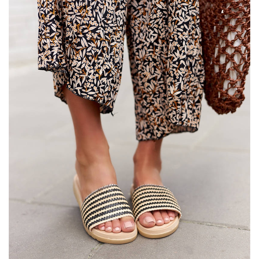 O modelo se caracteriza pelo salto plano de 3 cm de altura, o que os torna não só estilosos, mas também muito confortáveis para usar o dia todo. Graças à numeração padrão, você pode ajustá-los facilmente ao seu tamanho. Seu padrão listrado exclusivo acrescenta personalidade, e a falta de biqueira proporciona liberdade e ventilação, o que é especialmente valioso em dias mais quentes.