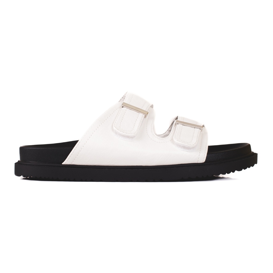 A sola com banda de rodagem, em plástico, garante aderência e durabilidade adequadas, o que os torna uma escolha confiável para o uso diário. Uma vantagem adicional é a sola preta, que contrasta perfeitamente com a cor branca dos chinelos, dando-lhes um toque fashion.