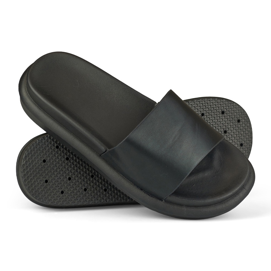 O seu design minimalista em preto elegante faz com que combinem perfeitamente com vários looks. Os chinelos possuem fecho deslizante, que permite uma colocação rápida e fácil. O nariz aberto certamente proporcionará conforto e respirabilidade, o que é especialmente importante em dias quentes.