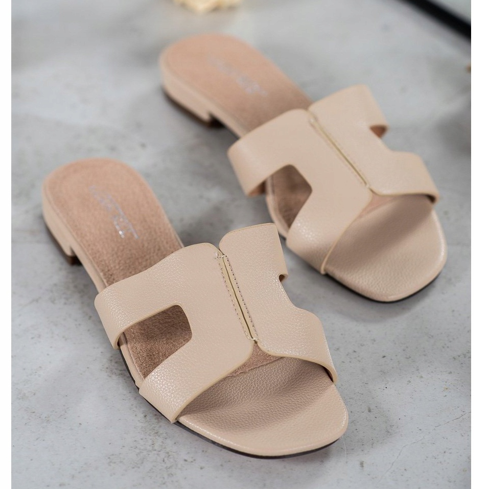 A cor marrom confere-lhes um caráter universal que pode ser facilmente combinado com muitos looks. Uma sola plana e confortável, com 2 cm de altura, garante conforto de uso mesmo após uso prolongado. Além disso, os chinelos têm salto aberto e design slip-on, o que torna extremamente fácil colocá-los e tirá-los.