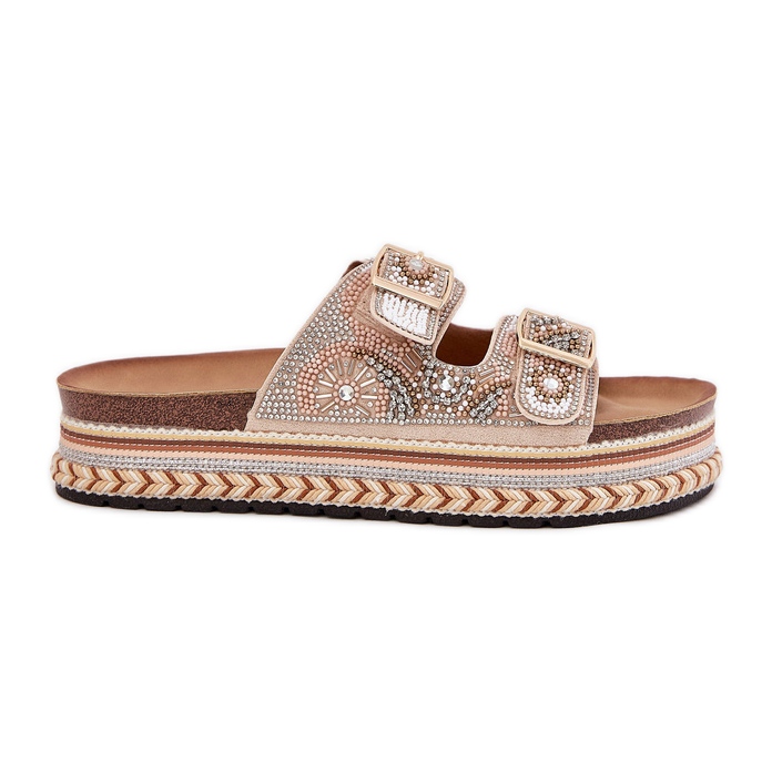 Detalhes: Chinelos com decoração e fivelas na plataforma de ouro dourado