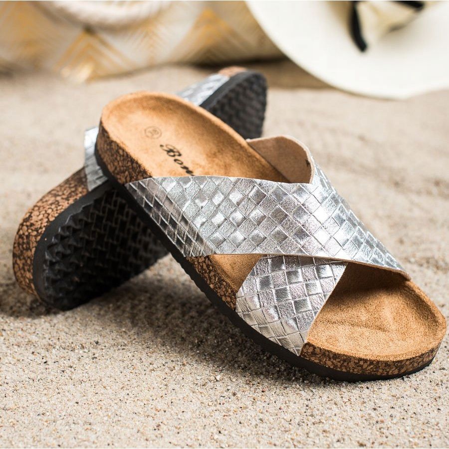 ** Chinelos confortáveis Bona feitos de couro ecológico prateado – escolha perfeita para a primavera e o verão **