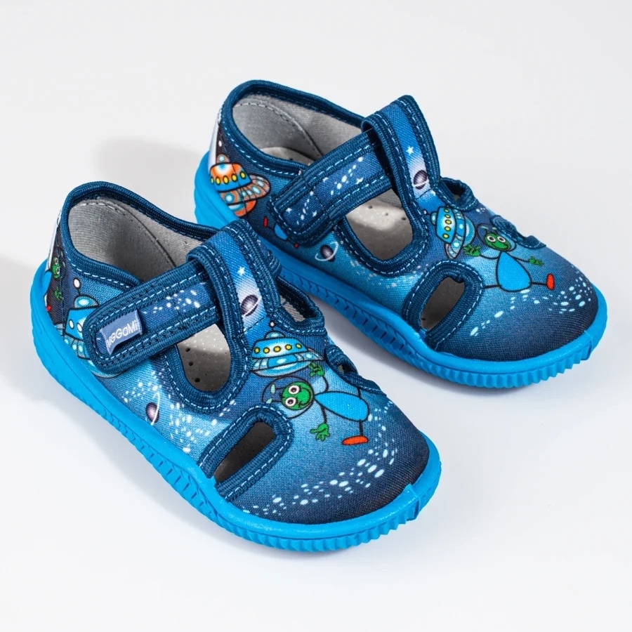 Os chinelos práticos e confortáveis de Viggami em uma cor azul da moda com um motivo de cosmos - perfeito para uma base diária para o lar e o jardim de infância. A combinação de uma blusa têxtil com uma inserção de couro confortável garante o conforto de usar o dia inteiro, e o salto construído dá uma segurando estável do pé.