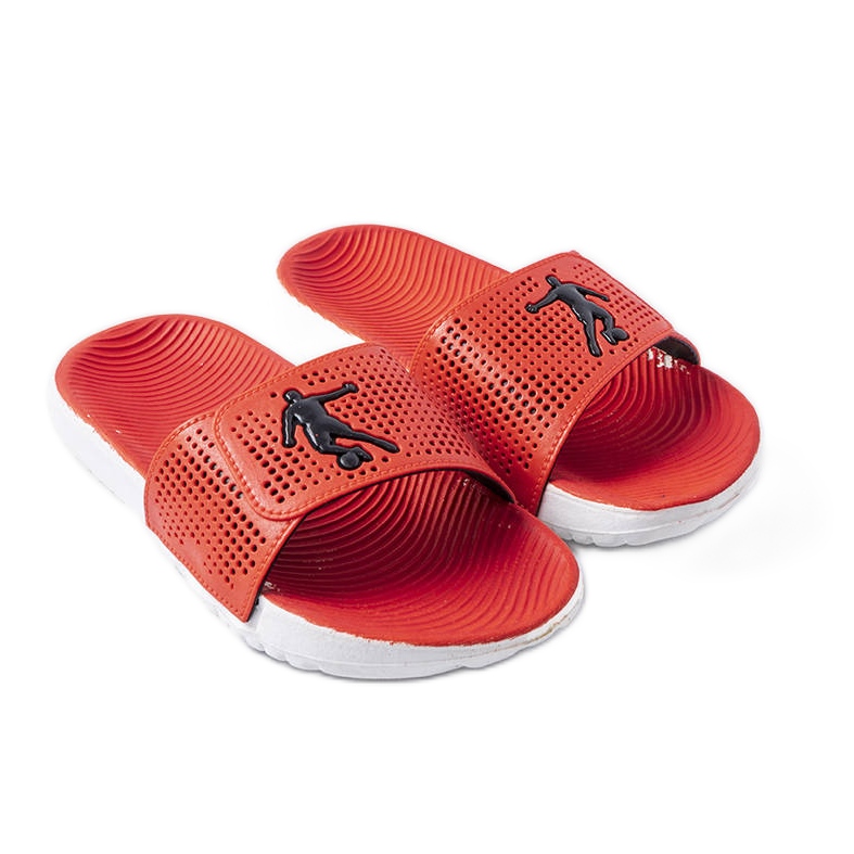 Atenas de borracha branca e vermelha Atenas chinelos e lixas infantis confortáveis, ideais para o verão. Um corte simples e descomplicado em uma cor vermelha energética com uma sola branca contrastante funcionará acima da piscina, na praia e durante os jogos do dia a dia.