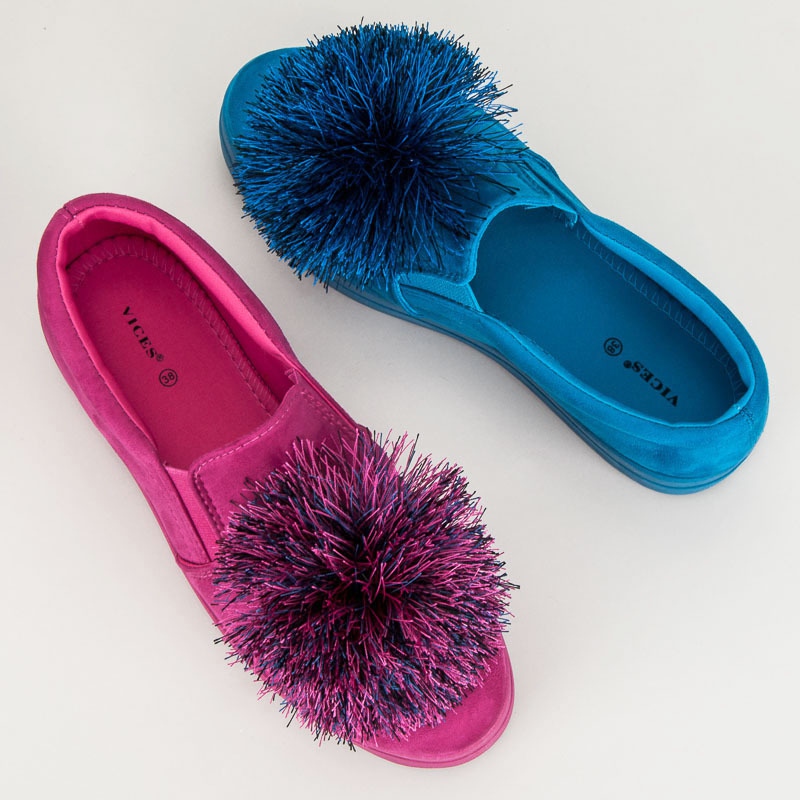 Os slipons distinguem-se pela biqueira redonda e pelo prático fecho slip-on, o que os torna fáceis de colocar e tirar. Além disso, seu charme é enfatizado por um elegante pompom, que lhes confere um caráter único. A altura do salto de 3 cm deixa o calçado confortável o dia todo e ao mesmo tempo levanta suavemente a figura.