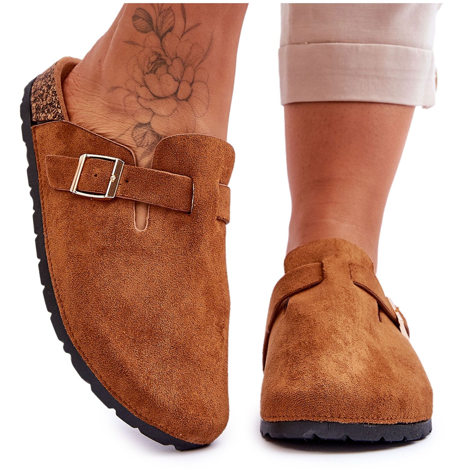 Os chinelos femininos elegantes e confortáveis feitos de camurça ecológica, embutidos em uma plataforma leve de cortiça. Perfeito para todos os dias - para a cidade, casa ou como papéis elegantes, graças a uma inserção de delito e perfil construído.