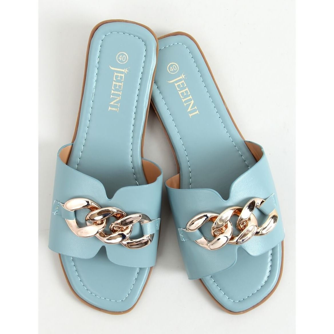 Confeccionados em couro ecológico de alta qualidade, esses chinelos combinam conforto com elegância. As cores em tons de azul com detalhes em correntes douradas fazem com que combinem perfeitamente com vestidos de verão e estilos casuais. A sola bege acrescenta sutileza e o salto plano torna-o confortável de usar o dia todo.