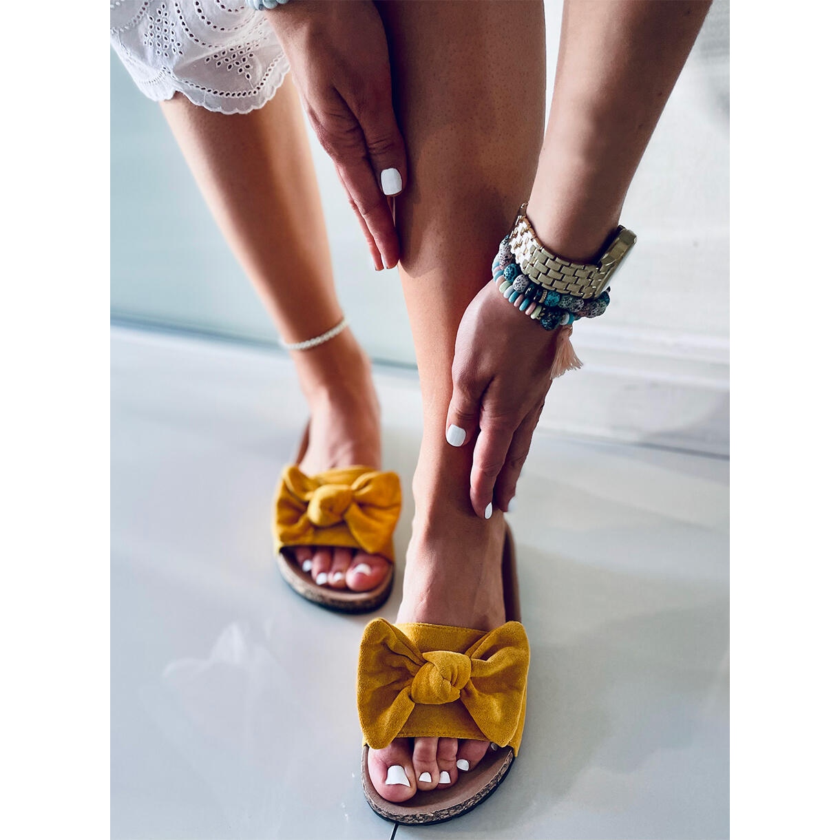 Descubra o conforto e o estilo do verão com os chinelos de cortiça Kiara Yellow! Estes chinelos femininos exclusivos combinam elegância e funcionalidade, tornando-os a escolha perfeita para os passeios do dia a dia. Um design simples e suave em uma cor amarela intensa, decorado com um laço sutil, irá adicionar frescor a qualquer estilo de verão.