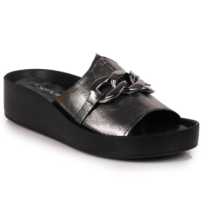 Descubra elegância e conforto de uso graças aos chinelos de couro T.Sokolski W SCA161 com corrente na atraente cor prata. Estes chinelos exclusivos são a escolha perfeita para os dias de verão, combinando um estilo casual com um toque moderno. Confeccionados com materiais de couro da mais alta qualidade, garantem não só durabilidade, mas também conforto graças ao forro de couro que se adapta ao formato do pé.