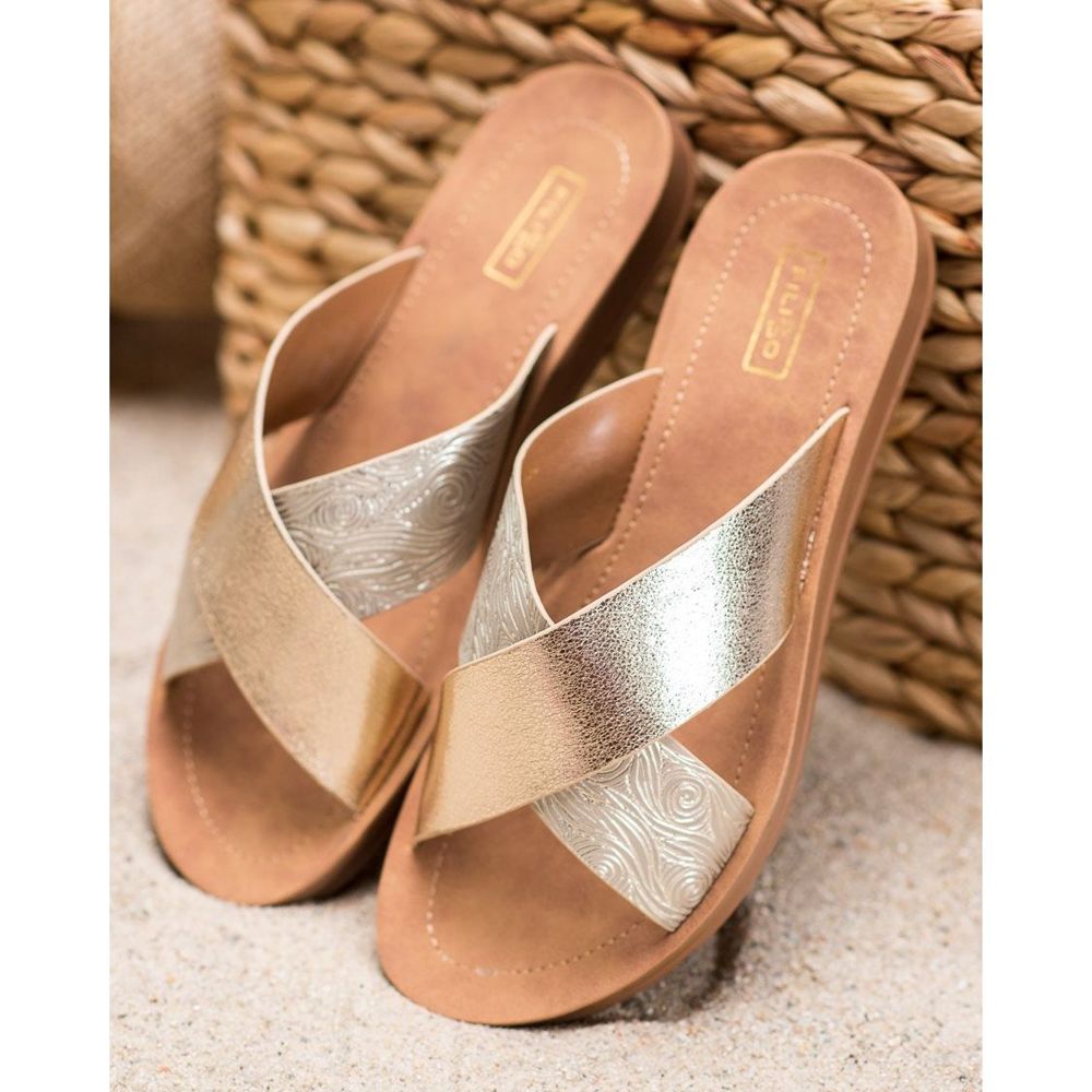 Descubra uma dimensão completamente nova de conforto e estilo com os chinelos brilhantes de couro ecológico da marca Filippo! Estes chinelos extremamente elegantes numa bela cor dourada são a escolha perfeita para todas as mulheres que desejam adicionar um pouco de brilho ao seu estilo do dia a dia.