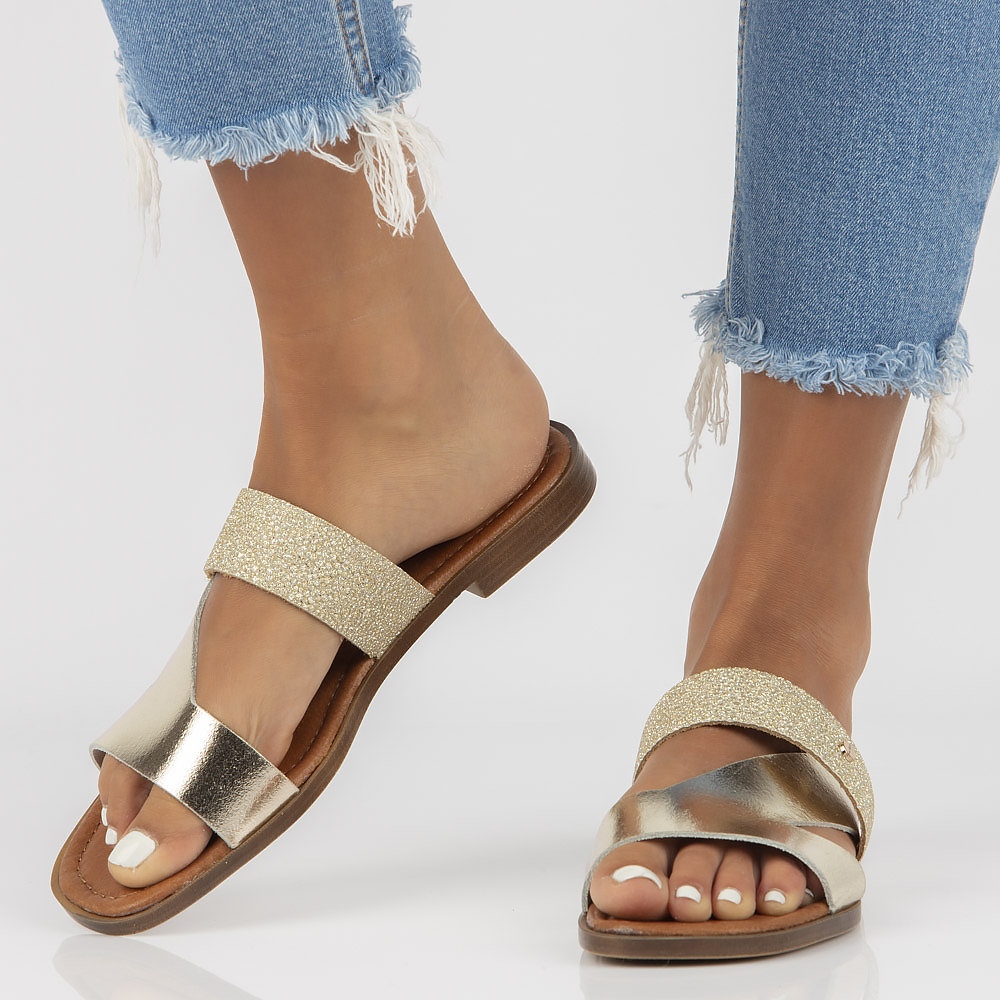 O modelo 40260 é caracterizado por salto plano de 1,5 cm e plataforma baixa de 0,5 cm, o que garante estabilidade e conforto no uso. O formato redondo da biqueira confere subtileza e a cor dourada torna-os na escolha ideal tanto para os passeios do dia a dia como para ocasiões mais elegantes.