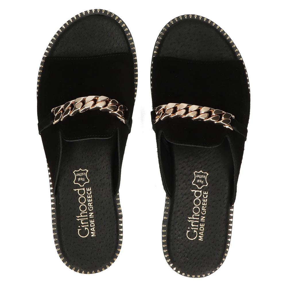 A cor preta e o design minimalista tornam os chinelos perfeitamente alinhados com as últimas tendências da moda, e detalhes adicionais na forma de strass e uma corrente acrescentam personalidade a eles. Sem biqueira, com formato redondo e salto de apenas 1 cm de altura, estes chinelos são a escolha perfeita para os dias quentes, tanto na cidade como para viagens.