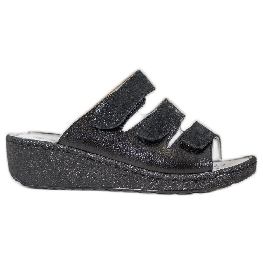 Estes elegantes chinelos são confeccionados em couro 100% natural, o que aumenta sua durabilidade e encanta pela estética. A cor preta do calçado é uma escolha universal que facilita combinar os chinelos com uma variedade de estilos - do casual aos conjuntos mais elegantes.