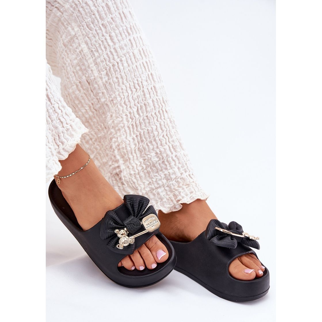 Detalhes: Chinelos de espuma feminina na plataforma com um arco e um broche preto