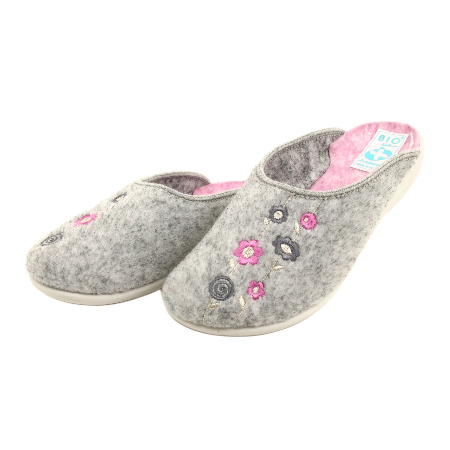 Felas de feltro cinza Adanex 27885 Sara com flores - uma combinação de conforto e um padrão encantador. O feltro macio e quente envolve suavemente o pé, e a sutil cor cinza decorada com flores rosa dão a personagem feminina de calçados em casa. Estes são os chinelos perfeitos para aqueles que, depois de um dia de salto alto ou sapatos pesados, querem deixar seus pés descansarem sem desistir do estilo.