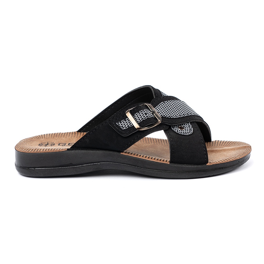 A sola feita de plástico durável garante estabilidade e conforto ao caminhar, e a inserção do couro ecológico aumenta ainda mais o conforto do uso. Esses chinelos estão disponíveis em uma cor preta clássica, que pode ser facilmente combinada com várias estilizações.