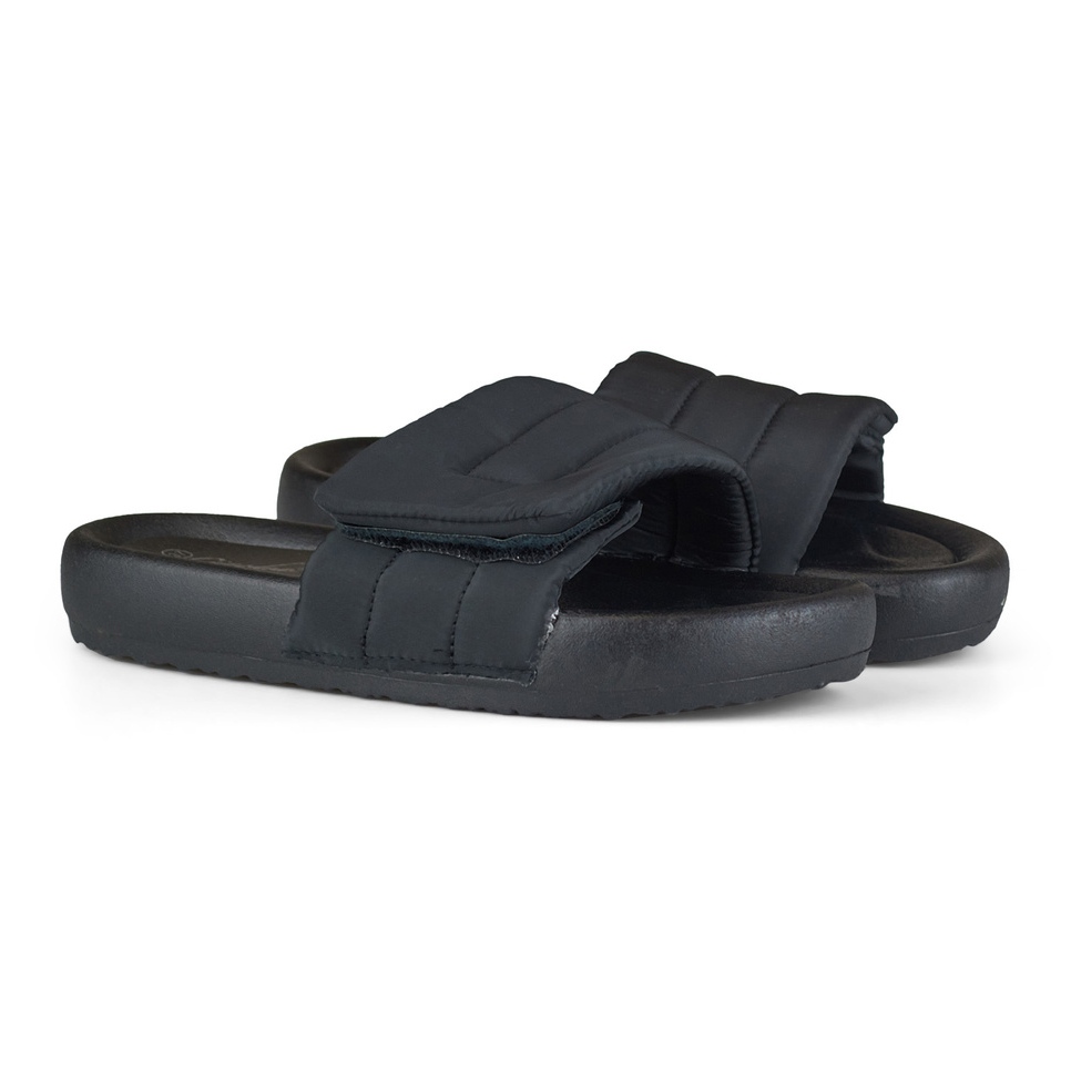 Detalhes: Chinelos de mulher pretos ajustáveis com velcro