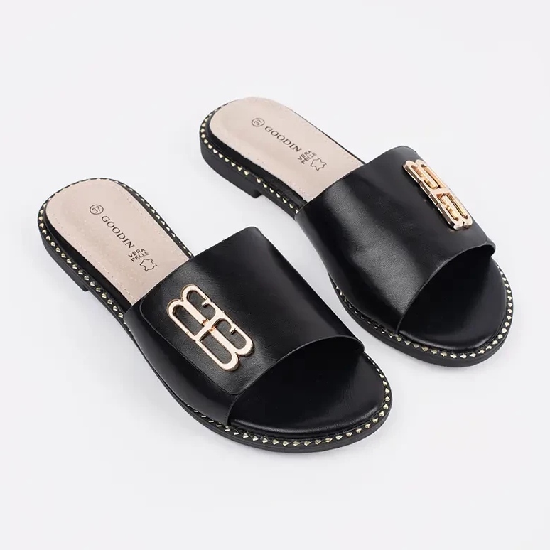 Goodin Goodin Chinelos de mulheres negras em uma sola plana com um ornamento preto