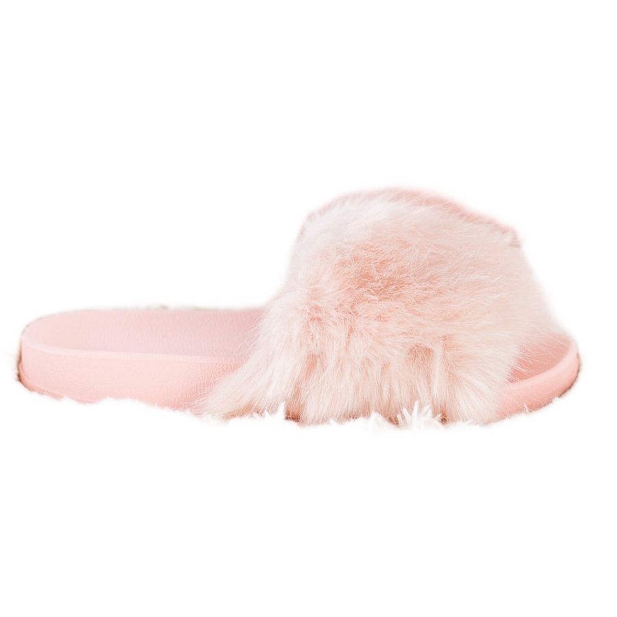 A cor rosa claro dos chinelos se adapta perfeitamente às tendências de primavera e verão, e o pelo decorativo acrescenta um charme único a eles. Graças ao seu estilo clássico e casual, podem ser usados com sucesso todos os dias, tanto em casa como em passeios pela cidade. Os saltos abertos e o design slip-on tornam extremamente fácil e confortável colocar e tirar os chinelos.