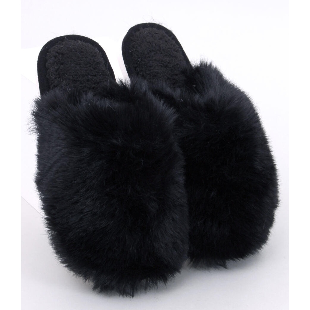 O design destes chinelos combina características clássicas: são pretos, o que os faz combinar com a maioria dos looks de casa, têm bico redondo e são decorados com pele macia adicional. Graças ao salto plano, proporcionam estabilidade e conforto ao caminhar pela casa.