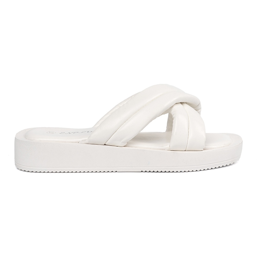 Feito de couro ecológico de alta qualidade, a parte externa e interna da garantem a durabilidade não apenas, mas também o conforto de usar o dia todo. Os chinelos de cores brancos são um must-have absoluto em todos os guarda-roupas, porque se misturam perfeitamente com roupas casuais diárias e combinações mais elegantes.
