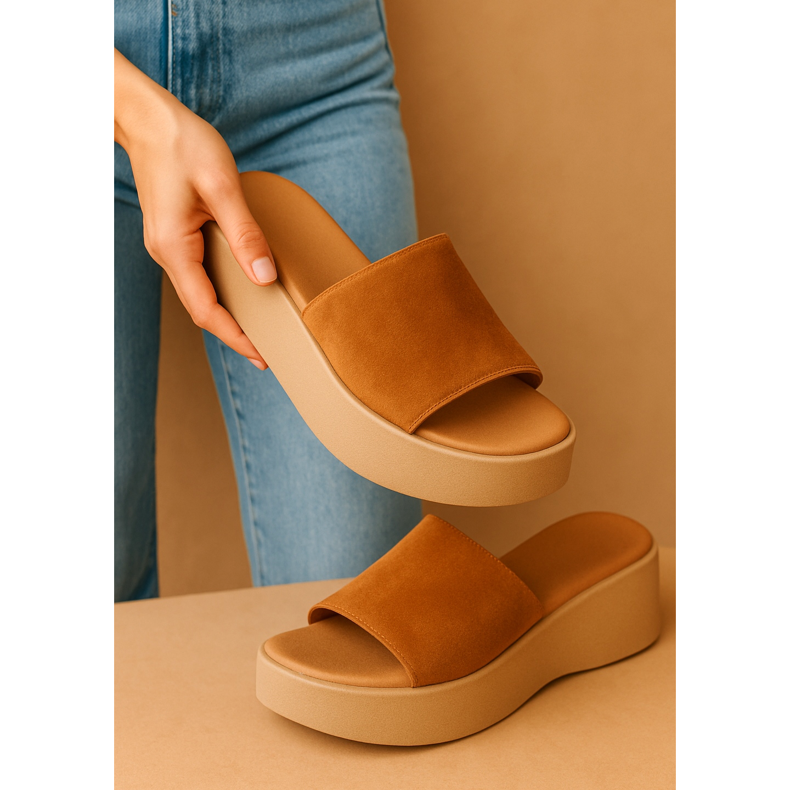 As plataformas de camurça requerem cuidados mais delicados. Escove-os regularmente com uma escova de camurça de borracha, que removerá a poeira e levantará os pelos do material. Antes da primeira utilização e regularmente ao longo da estação, impregne-os com um preparado que proteja contra a humidade e as manchas. Evite usar chinelos de camurça em dias chuvosos. Se aparecerem manchas, use uma borracha especial para camurça ou leve os sapatos para uma limpeza profissional.