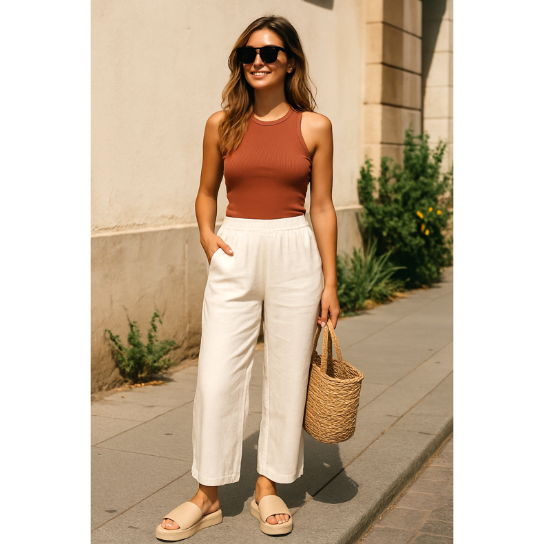 Calças de linho largas ficam fenomenais com abas de plataforma. Escolha calças brancas ou creme e combine-as com um top justo em cor contrastante, como terracota ou verde garrafa. Adicione uma bolsa de vime e óculos de sol grandes. Este estilo é perfeito para almoçar no jardim de um restaurante ou para uma feira urbana de verão.