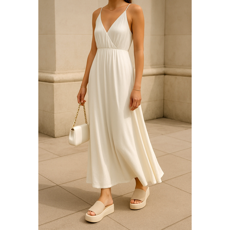 Para um vestido maxi longo feito de materiais delicados e arejados, escolha chinelos em plataforma média em tom suave. Plataformas brancas ou bege combinam perfeitamente com um vestido monocromático brilhante. Adicione pequenas joias de ouro e uma pequena bolsa de corrente. Este estilo será perfeito para um casamento de verão no jardim, uma festa no jardim ou uma elegante festa ao ar livre.