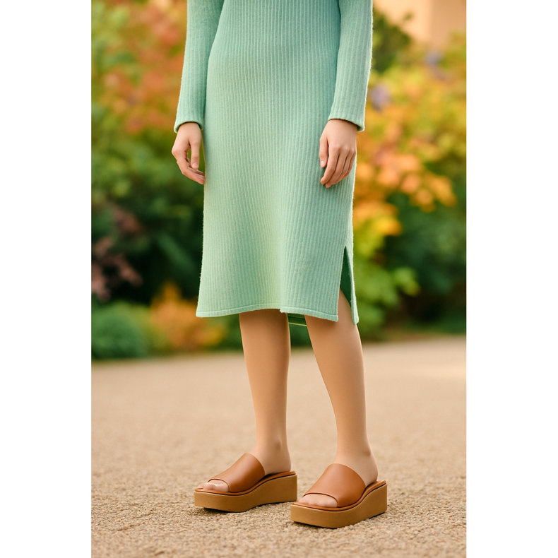 Use mulas plataforma nude com um vestido camiseta de cor sólida. Este conjunto minimalista é extremamente confortável e elegante ao mesmo tempo. Você pode usá-lo durante viagens, festivais ao ar livre ou passeios casuais de fim de semana. Se o vestido for solto e oversized, enfatize a cintura com um cinto fino para dar estrutura à silhueta.