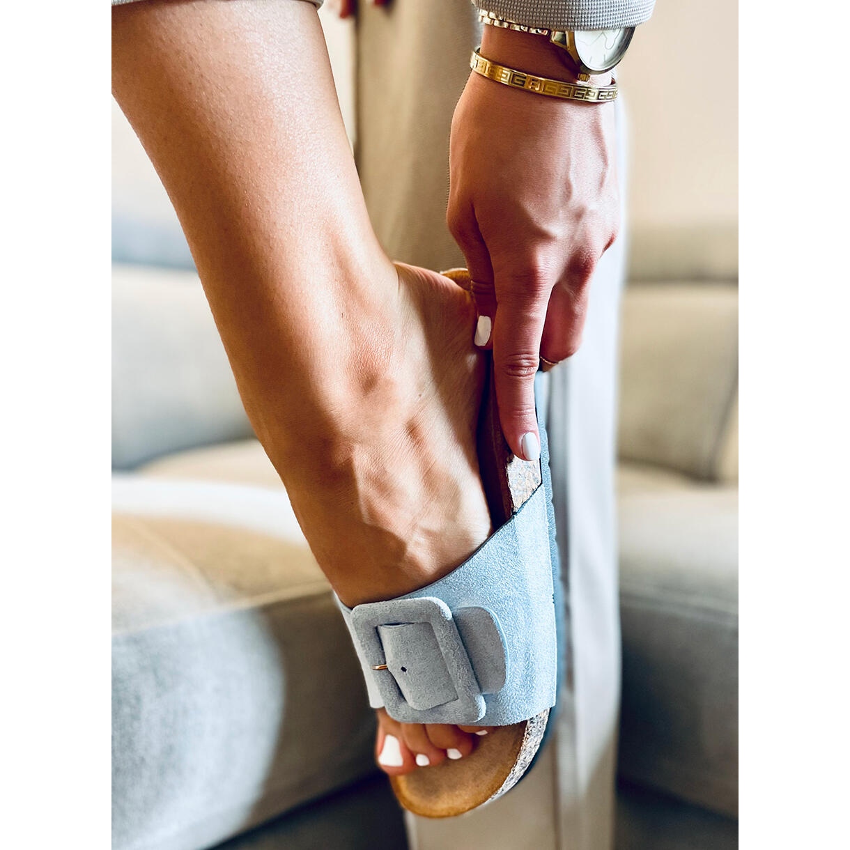 Os chinelos Priya Blue com sola de cortiça são a escolha perfeita para mulheres que valorizam conforto e estilo. Estes chinelos de camurça numa linda cor azul combinam perfeitamente com a natureza casual do estilo do dia a dia. Um cinto largo com fivela ajustável permite um ajuste perfeito ao pé, e a palmilha interna perfilada garante conforto mesmo no uso prolongado.