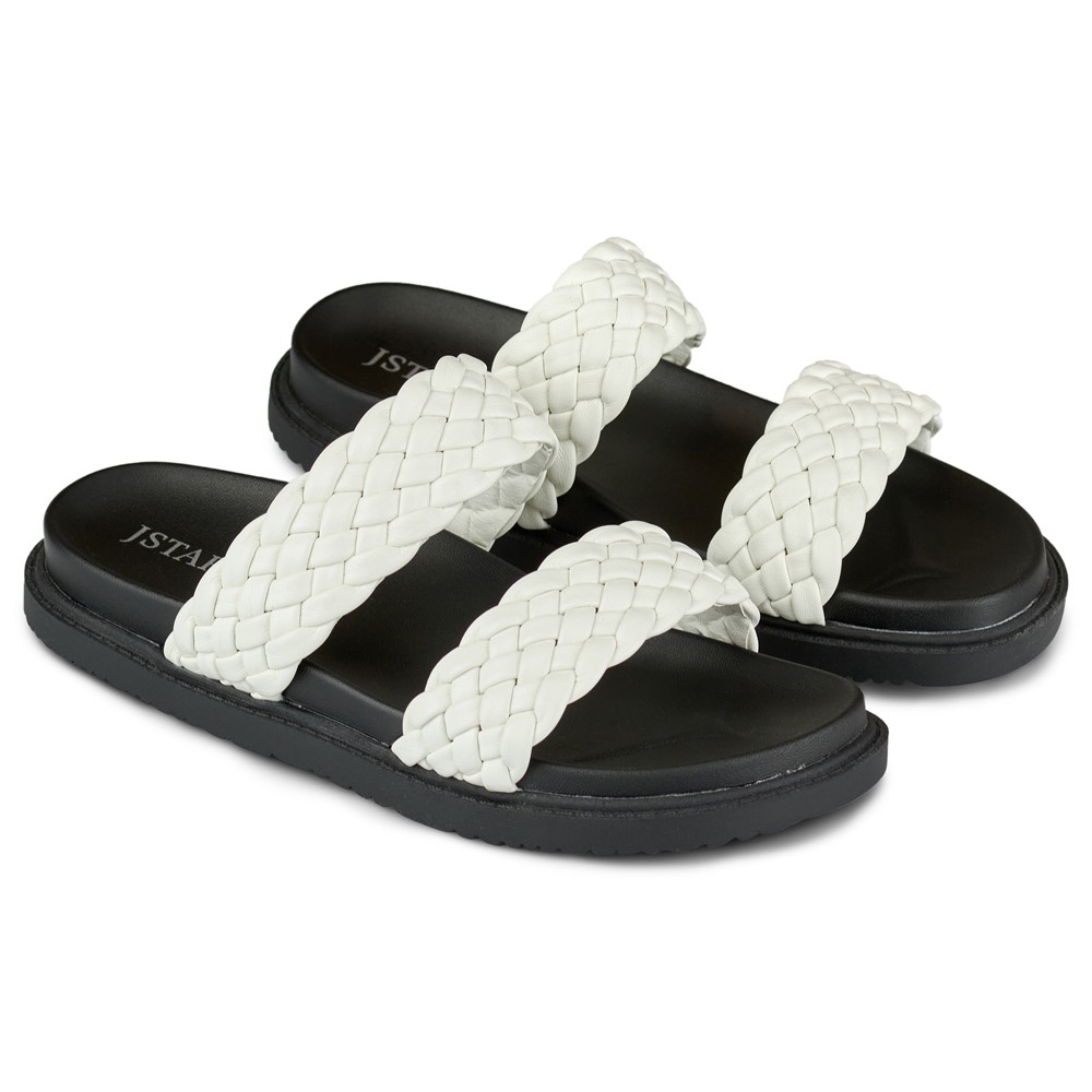 O seu design minimalista numa clássica cor branca com elementos pretos confere-lhes um carácter único, pelo que combinam tanto com vestidos de verão como com calças casuais. O salto plano de 2,0 cm de altura garante conforto no uso e a biqueira aberta permite que os pés respirem livremente nos dias quentes.