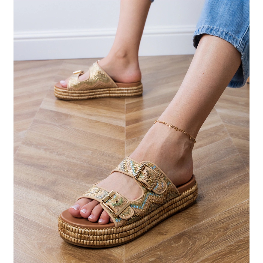 Feito de plástico de alta qualidade, eles oferecem não apenas estilo, mas também durabilidade. O nariz redondo combinado com uma plataforma de 4 cm de altura garante conforto o dia todo, o que é particularmente importante em dias quentes. Além disso, a sola de plástico marrom não apenas parece na moda, mas também cativos com sua praticidade, resistência à abrasão e boa espera em várias superfícies.